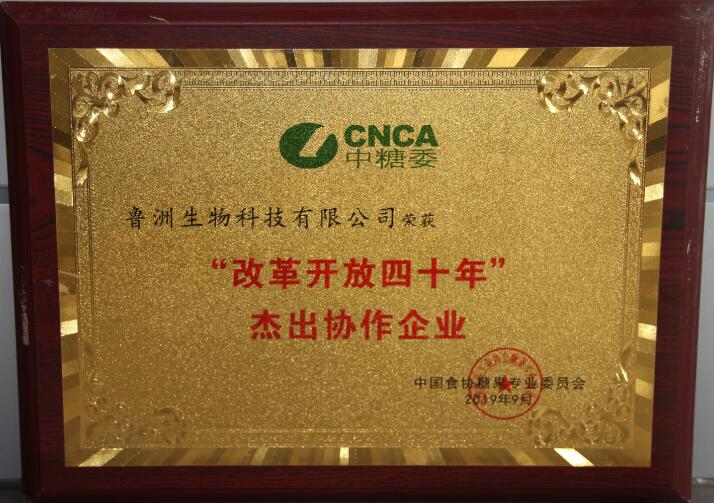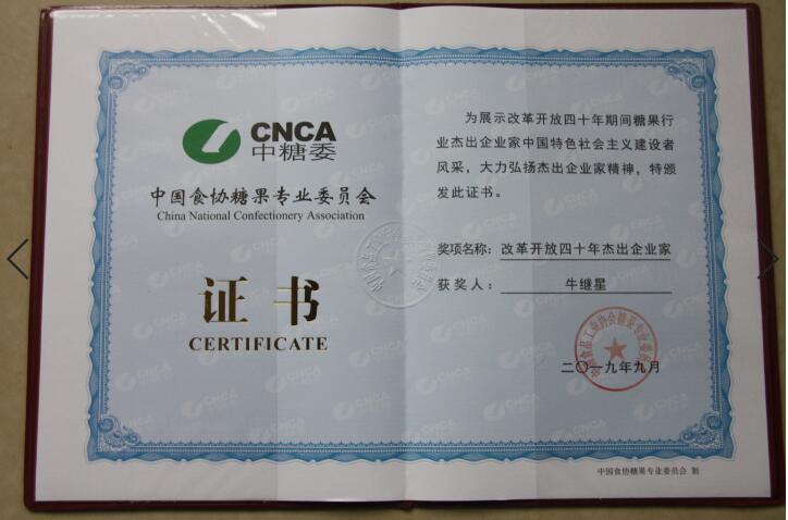 魯洲生物科技有限公司榮獲中國(guó)食協(xié)糖果專業(yè)委員會(huì) “改革開放四十年”杰出協(xié)作企業(yè),董事長(zhǎng)牛繼星榮獲“改革開放四十年”杰出企業(yè)家。